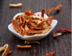 新鲜的橘皮中含有大量的维生素C和香精油,具有理气化痰、健脾和胃等功能。将其咀嚼后吐掉残渣,重复数次,对去除口腔异味比较有效。橘皮泡茶,味道清香,还能通气提神。