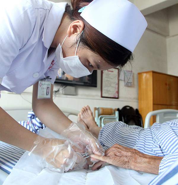 比如要给病人做很多日常护理。有一次,我去临床科室拍一些素材,恰巧一位护士走进病房准备给一位病人做基础护理——修剪指甲。我摆好位置,端起相机,准备把这一幕记录下来。就在这时我透过镜头发现她额上渗出了一颗黄豆大的汗珠,我瞬间为之震动。透过这颗汗珠,我似乎看到了她们平时忙碌得团团转的一幕幕:打针、换药、吸痰、擦身、给病人讲解病情和注意事项、为病人清理大小便……或许在你看来这些字眼都不复杂,可每一个字眼背后都有着难以言说的艰辛与繁琐。