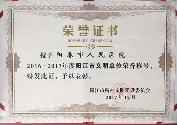 日前,阳江市举行2016-2017年度精神文明建设表彰大会暨“德耀漠阳”阳江市道德模范和身边好人现场交流活动,会上宣读了《关于表彰2016-2017年度阳江市精神文明建设先进单位的决定》,对各级精神文明建设先进单位进行了表彰,并向2016-2017年度新增的“中国好人”、“广东好人”颁发证书。我院被授予“2016-2017年度阳江市文明单位”荣誉称号,是阳春卫计系统唯一获此殊荣的单位。