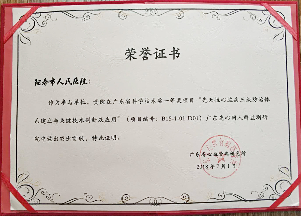 近日,广东省先天性心脏病防治监测网领导小组、广东省心脏病研究所发来通知,其研究课题《先天性心脏病三级防治体系建立与关键技术创新及应用》(项目编号:B15-1-01-D01)获得广东省科学技术奖一等奖。我院作为参与单位之一,在广东先心网人群监测研究中发挥了重要重要,为课题研究作出了积极贡献,受到表彰。