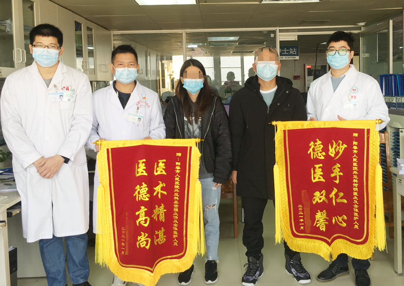 术后第二天,经多方联系终于找到家属,原来患者是广西来阳春工作的梁先生,其姐姐和父亲随后着急地从外地赶来阳春。经过神经外科医护人员1 个多月的积极治疗和精心护理后,昏迷多天的梁先生逐渐转为清醒,最终完全康复出院。出院后,梁先生在姐姐的陪同下特意给神经外科全体医护人员送上两面分别书有“医术精湛 医德高尚”、“妙手仁心 德医双馨”的锦旗,由衷感谢神经外科医护人员给了他第二次生命。