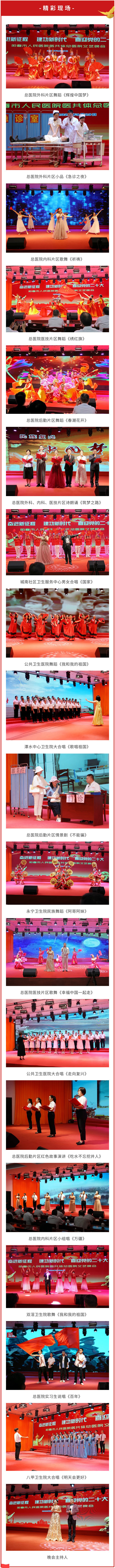 本次晚会由总医院党委办主办、院工会承办,经过全院上下和医共体成员单位为期一个月的精心准备,当晚总医院4个片区科室和实习生以及各成员单位以舞蹈、歌曲、朗诵、情景剧、小品、合唱、小组唱、说唱、红色故事演讲等文艺表演形式呈现了18个节目。节目紧紧围绕主题,将政治性、思想性与艺术性融为一体,深刻缅怀党的光辉历史,热情讴歌党的丰功伟绩,展现了全院干部职工勇于担当、拼搏奋进,苦干实干、锐意进取,做新时代的奋进者、开拓者、奉献者的良好精神风貌。整场演出气势恢宏,一段段精彩的表演,时而热情洋溢、慷慨激昂,时而低声倾诉、娓娓道来,赢得台下掌声阵阵。