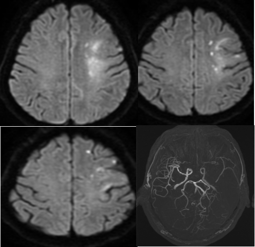 患者转回CCU监护生命体征平稳,但于下午约16:50出现嗜睡、失语、右侧肢体无力,请脑科中心二区刘添副主任医师急会诊,查看患者完全性失语,右侧肢体肌力0级,无恶心、呕吐,考虑急性缺血性脑卒中。急查颅脑核磁共振检查见:左颞叶、半卵圆中心、放射冠、岛叶多发急性梗死;磁共振血管造影见:左侧大脑中动脉闭塞、双侧大脑前动脉未显影,定位左侧大脑半球,责任血管为左侧大脑中动脉。综合检查,考虑患者大血管闭塞,静脉溶栓效果不佳,建议跨过溶栓,直接血管内取栓治疗。