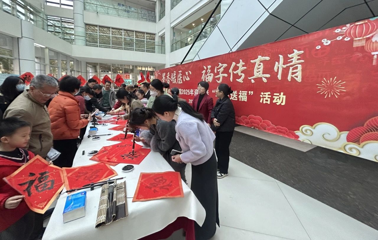 活动现场,长桌排开,笔墨铺陈。由员工、家属组成的书法爱好者们齐聚,大家并肩挥毫,笔锋游走如龙,大红宣纸落墨生花,一个个饱满圆润、福气四溢的“福”字,一副副寓意美好的春联相继诞生。过往的患者与家属被吸引,纷纷驻足欣赏这饱含年味和祝福的创作过程。